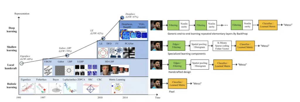 یک پیشرفت بزرگ در اوایل دهه ۲۰۱۰ با ظهور یادگیری عمیق، به ویژه شبکههای عصبی کانولوشنال (CNN) رخ داد. روشهای پیشرفتهای مانند DeepFace و DeepID از چندین لایه پردازش برای یادگیری ویژگیهای دقیق چهرهها استفاده میکنند. روشهای یادگیری عمیق، سیستمهای تشخیص چهره را بسیار دقیقتر و قابل اعتمادتر کردهاند و آنها را برای بسیاری از کاربردهای دنیای واقعی موثر میسازند.