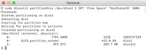 sudo diskutil partitionDisk /dev/disk<n> 1 GPT "Free Space" "%noformat%" 100%